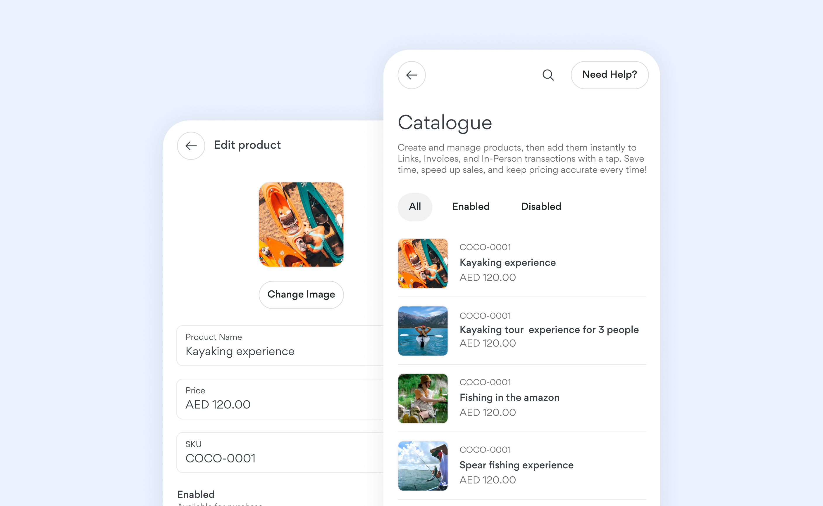 Tap ‘Create product’ and select “Create”. Enter the product name, price, and SKU. You may also upload a photo of your product, which will be used in an upcoming feature we’re building. Once everything looks good, save it to add the product to your catalogue.Import products in bulk