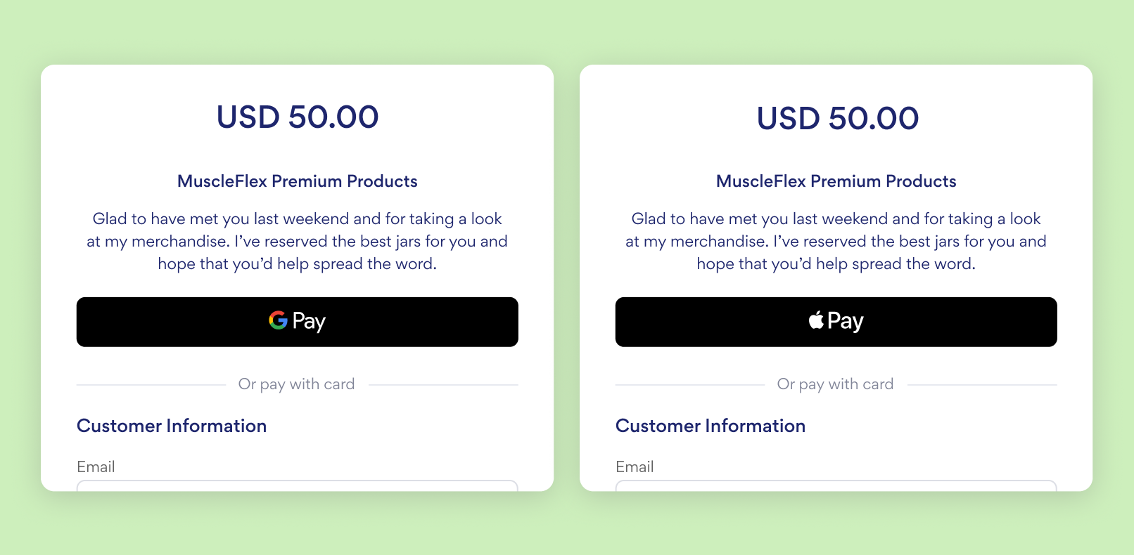 When your customers scan a QR Code on their Apple Pay or Google Pay enabled device they will be able to complete the purchase by tapping on the Apple Pay or Google Pay button. No manual input needed!