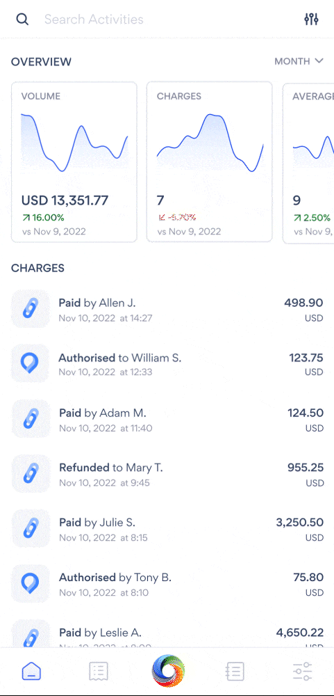 - Tap “Charge”: Choose your input method and complete the charge: a. Available on iOS if you’re processing an in-person charge in USD or have a US Stripe account connected to Nomod. Available on all NFC enabled Android devices for all currencies. Just tap your customer’s card against the back of your device and process the payment b. QR Code: Display a QR code that your customer can scan using their own device, and pay either by entering their card details or using an ewallet like Apple Pay or Google Pay c. Scan: Use your device’s camera to scan your customer’s card and process the payment d. Link: Send a quick payment link over any messaging platform e. Typed: Enter your customer’s card details manually