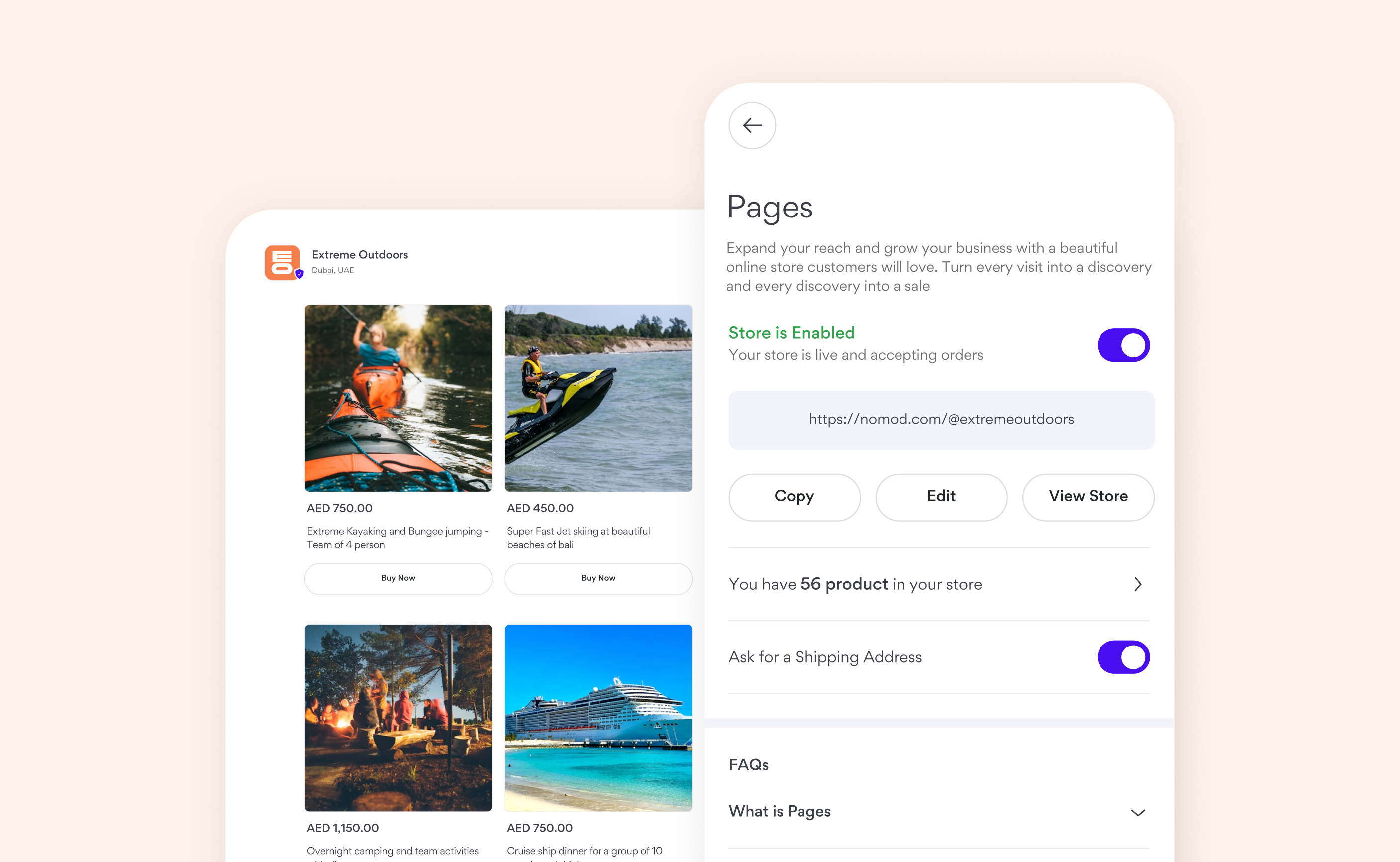 Customers visiting your store will see a list of your available products. When they find a product they want to buy, they simply tap Buy Now and are taken directly to checkout to complete their purchase securely. There’s no cart system, each product is purchased individually, keeping the process simple and fast for your customers. All payments are processed using the payment methods you’ve enabled in your Nomod account, such as card payments, Apple Pay, Google Pay, and more.Managing Your Store