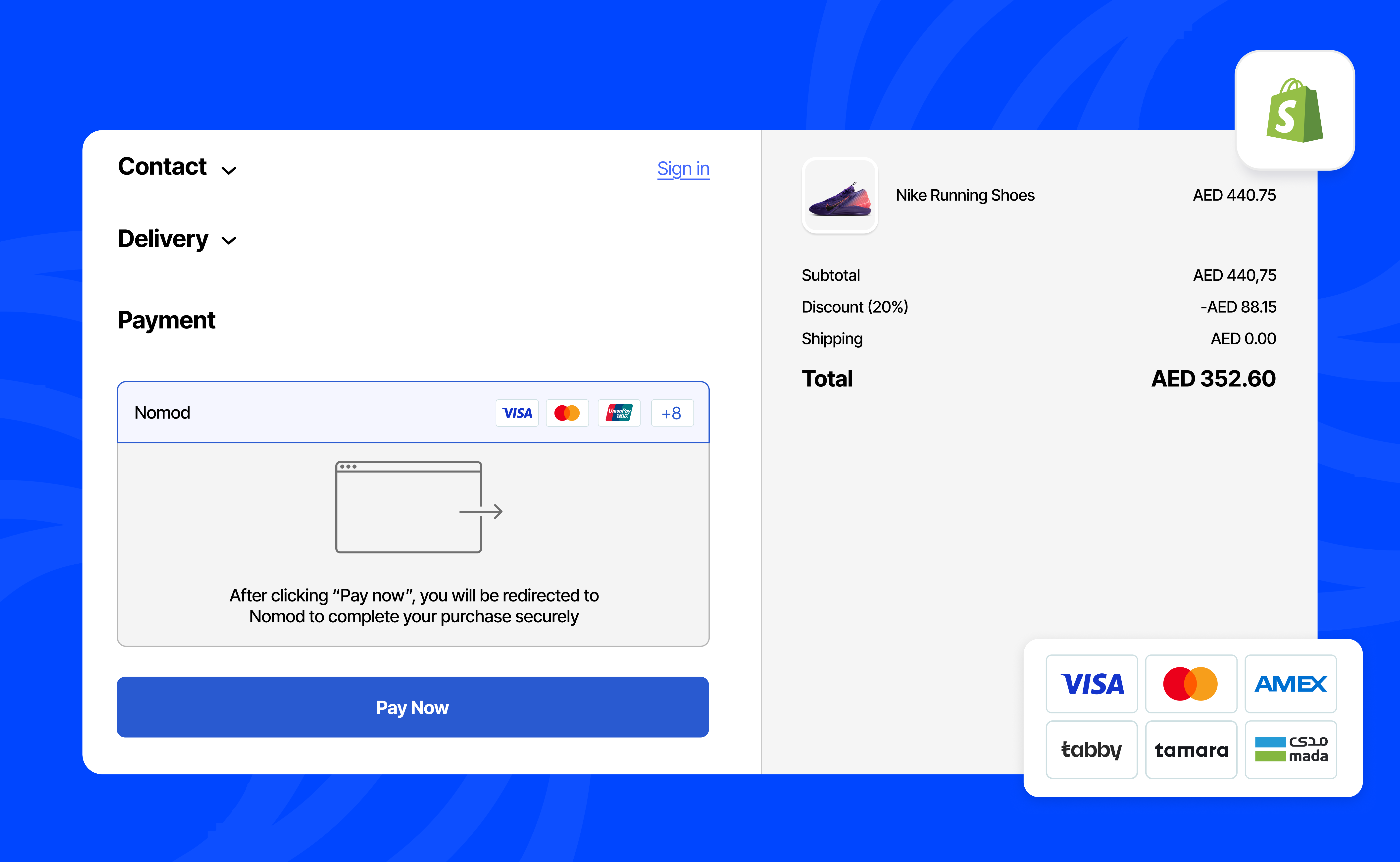 When you connect Nomod Payment Gateway to your Shopify store, your checkout gets a new option for customers to pay securely through Nomod. Once they choose it, they’re redirected to a secure Nomod checkout page where they can pick from a wide range of payment methods, including including Tabby, Tamara, Visa, MasterCard, Amex, Mada, and other major card networks. Every order is tracked in your Checkout activity screen inside the Nomod app, where you can manage orders, issue refunds, and view detailed reports. At the same time, your order records sync automatically with your Shopify records, keeping you up to date on both ends.Connecting a Shopify store