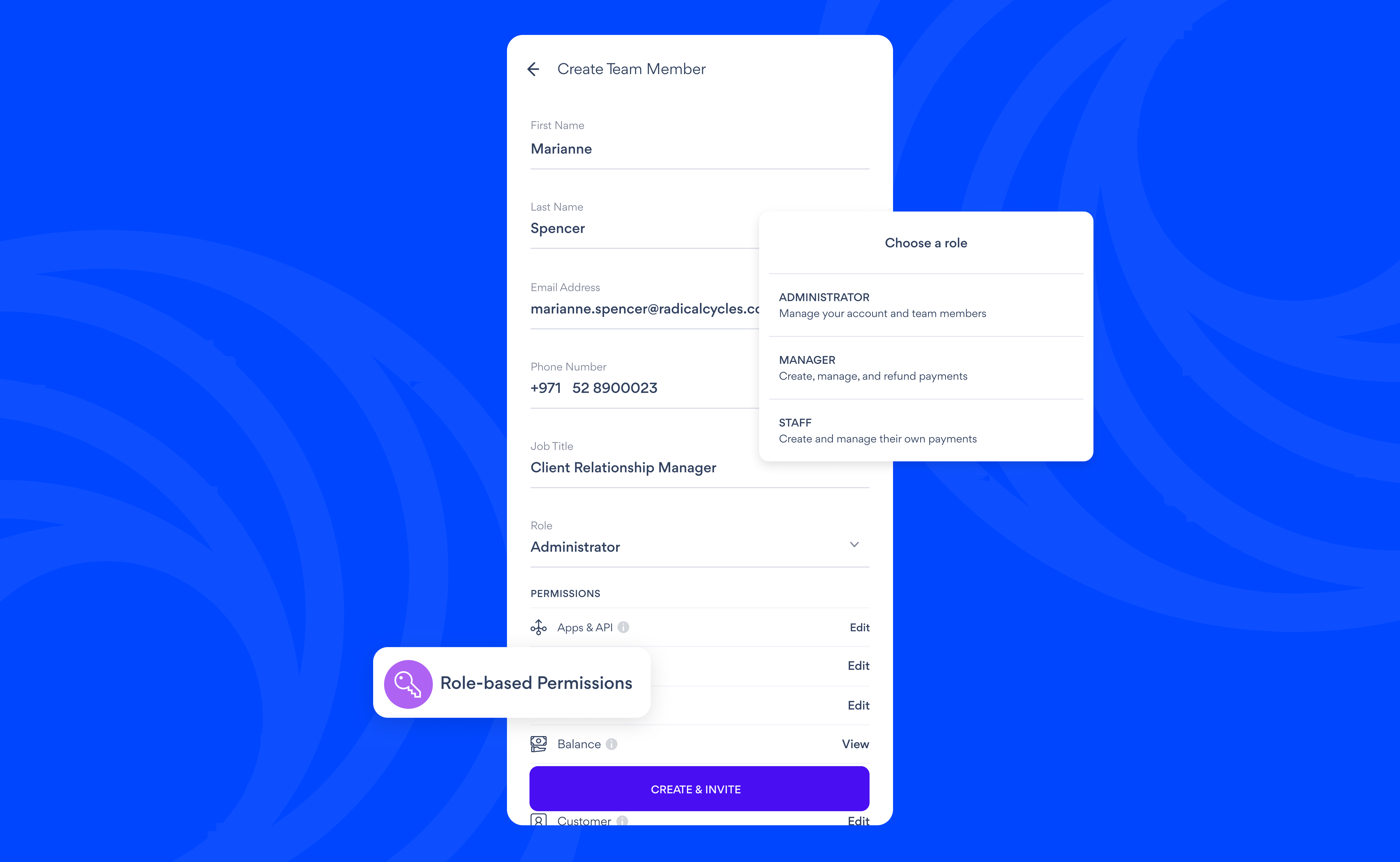 Can create, manage, and refund payments across the team, as well as handle invoices and stores, but don’t have access to high-level account settings.Staff